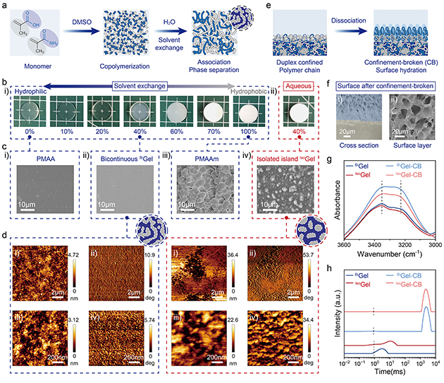 图2. (a) 通过溶剂交换策略制备结构可调线性共聚物水凝胶网络的示意图。(b) 不同MAAm含量(摩尔分数)水凝胶的宏观光学照片。(c) 不同水凝胶的扫描电镜图像。(d)原子力显微镜高度图与相图。(e) 表面限域破坏处理形成润滑层的示意图。(f) 截面扫描电镜图像,显示梯度结构。(g)限域破坏后样品表面的ATR-FTIR光谱。(h) 不同水凝胶的LF-NMR T₂弛豫时间分布。