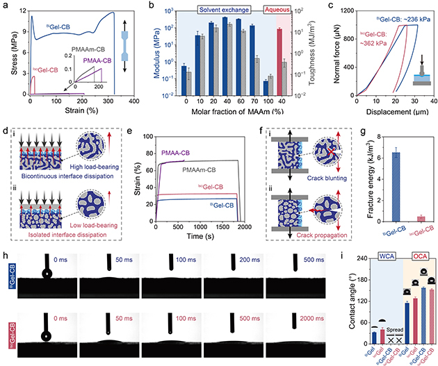 图3. (a) 不同水凝胶的单轴拉伸应力-应变曲线。(b) 杨氏模量和韧性与MAAm含量的关系。(c) 表面纳米压痕测试曲线。(d) 抗蠕变性能测试示意图及(e)蠕变曲线。(f) 纯剪切测试示意图及(g)断裂能结果。(h) 水滴在表面的动态铺展过程。(i) 超亲水及水下超疏油性能评估。