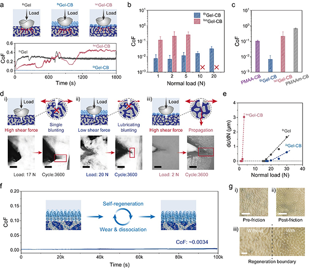 图5.(a) 摩擦测试示意图及对应的摩擦系数曲线。(b) 摩擦系数随载荷的变化。(c)样品的平均摩擦系数。(d) 摩擦裂纹扩展示意图及裂纹光学图像。(e)界面裂纹扩展速率随载荷的变化。(f) 在50 N法向载荷下的长期润滑性能。(g) 在PBS溶液中摩擦测试前后的表面光学图像:i) 摩擦前,ii) 摩擦后,iii) 摩擦边界
