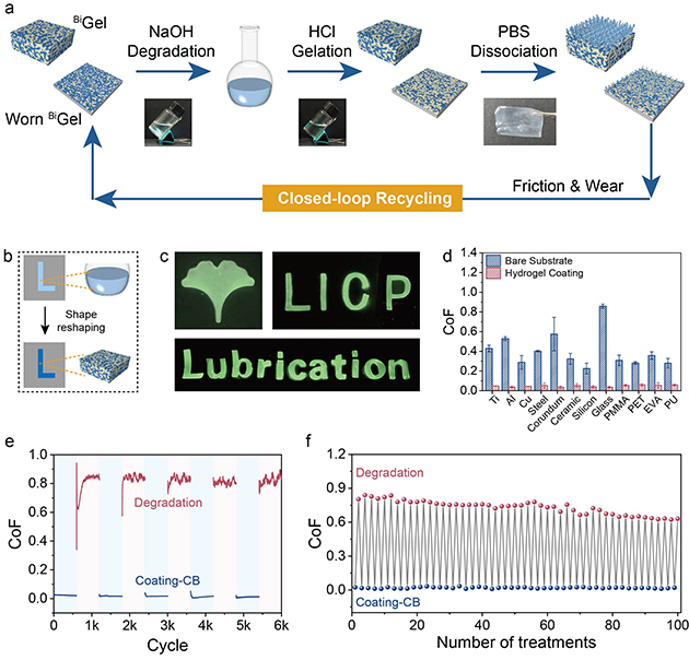 图6.(a) 鲁棒润滑系统的闭环回收示意图。(b) 形状重塑过程示意图。(c) 制造的不同形状水凝胶图案(银杏叶、研究所徽章“LICP”、文字“Lubrication”)。(d) 水凝胶涂层与相应裸基底摩擦系数的对比。(e) 降解-重建循环过程中的摩擦系数曲线及(f)平均摩擦系数值对比(以玻璃为基底,“处理次数”以奇数次代表涂层、偶数次代表降解来表征)