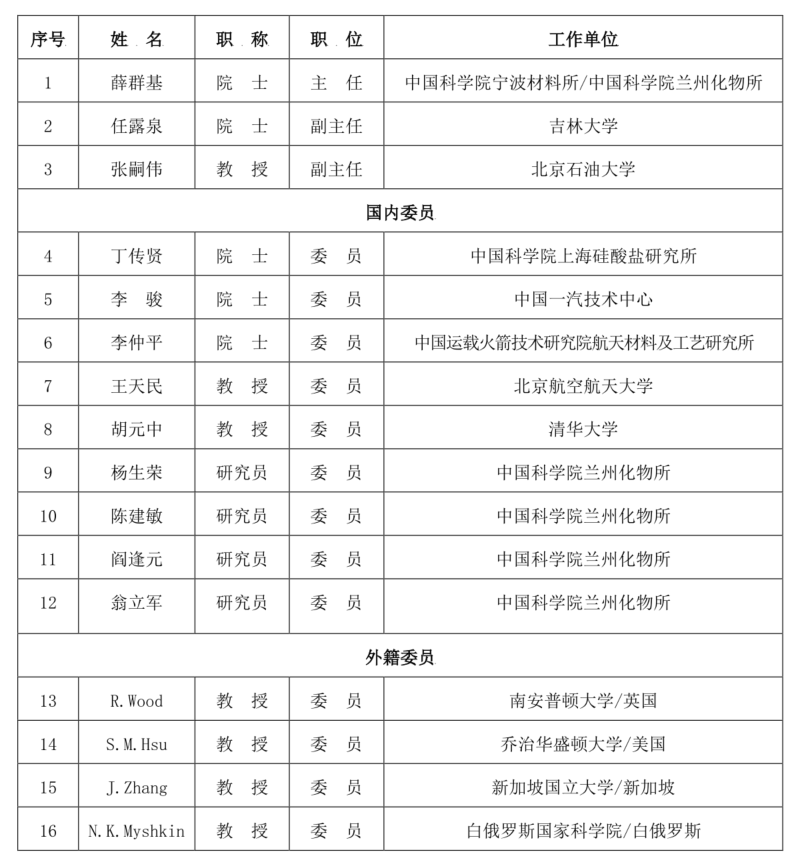 润滑材料全国重点实验室第一届指导委员会成员名单