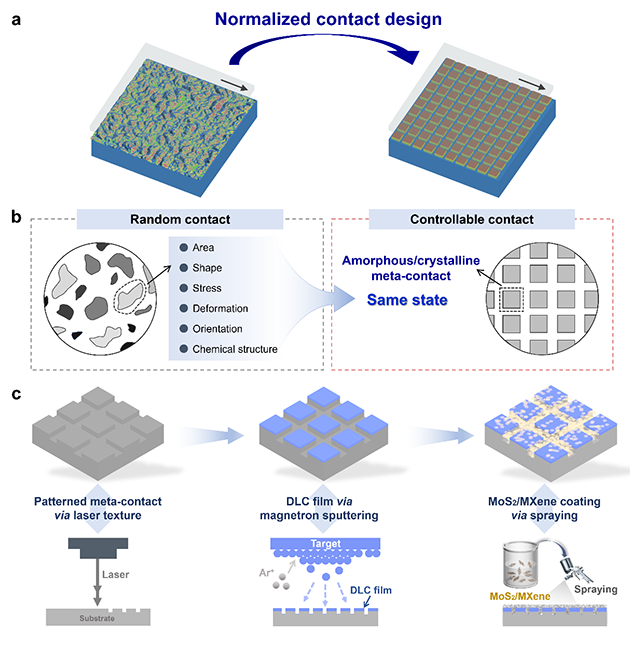 近日,中国科学院兰州化学物理研究所兰州润滑材料与技术创新中心磨损与表面工程课题组提出了一种基于归一化接触理念的工程超润滑设计原理,建立了从“宏观接触-微纳界面-分子构型-原子晶格”跨尺度结构协同调控方法,并与武汉大学欧阳稳根教授团队合作,结合理论模拟和实验揭示了摩擦界面晶格匹配的动态微观演变与超滑机理,在工程级接触尺寸(毫米级)、极端高接触应力(12.7 GPa)及实际大气环境(40% RH)下获得了稳健的超润滑性能,对推动超润滑走向工程化具有重要意义。