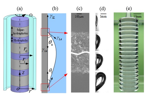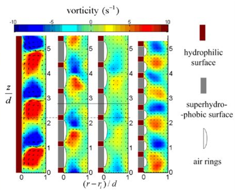 文章得到了三位审稿人一致的高度评价,认为“作者创造了一种利用束缚气体的减阻新概念”(“The authors created an inner cylinder that had alternating azimuthal stripes of hydrophilic and superhydrophobic bands”),“是利用宏观亲疏水图案结构实现显著减阻的新尝试”(“describe a novel application of macroscopic patterned superhydrophobic/ superhydrophilic stripes to give substantial drag reduction”),“作者聪明地利用了亲疏水条带结构的束缚作用,创造出连续环状气膜”(“The clever insight used by the authors is to create continuous toroidal bubbles which are pinned at the discontinuity between the hydrophilic and hydrophobic stripes”),“研究成果非常新颖、及时”(“The work is very novel, timely”)。