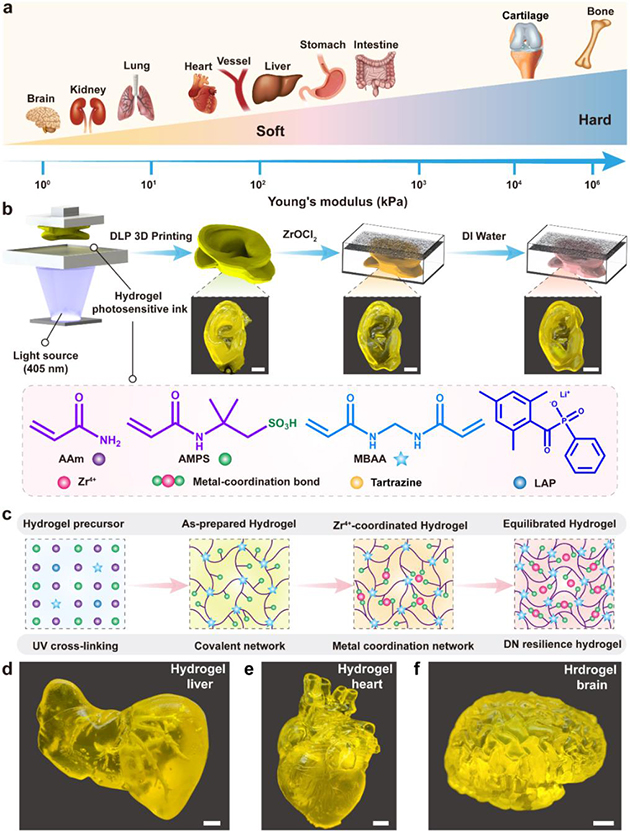 中国科学院兰州化学物理研究所固体润滑国家重点实验室3D打印摩擦器件研究团队提出了一种基于共价交联网络和金属配位网络的双交联网络策略制备刚度可调的弹性水凝胶。研究人员借助数字光处理3D打印技术,实现了各种结构复杂、保真度高、粘弹性可调的湿滑水凝胶软组织器官的一体化成型,且这些组织器官模型具有复杂的内部流体通道和腔体结构、血管化的组织结构、逼真的解剖结构等。