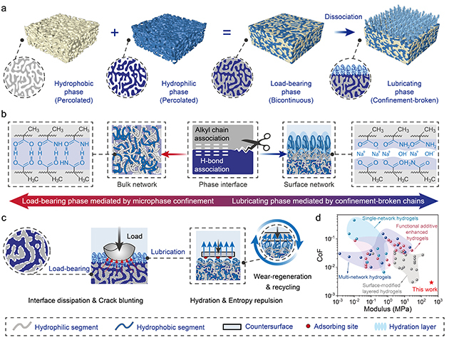 在人体关节中,软骨依托多尺度胶原网络、多相组分及其界面的协同作用,构建出兼具高承载与超低摩擦的天然润滑系统。基于这一特性,水凝胶作为有潜力的人工软骨替代材料备受关注。然而,传统润滑水凝胶往往因结构均一性而陷入两难境地,提高整体网络致密度虽能增强力学性能,却会削弱表面水合与润滑能力;单纯追求低摩擦,又会使材料在高载荷下迅速变形、蠕变甚至失效。这种长期存在的性能权衡,严重制约了水凝胶在高载荷、长寿命润滑场景中的实际应用。
