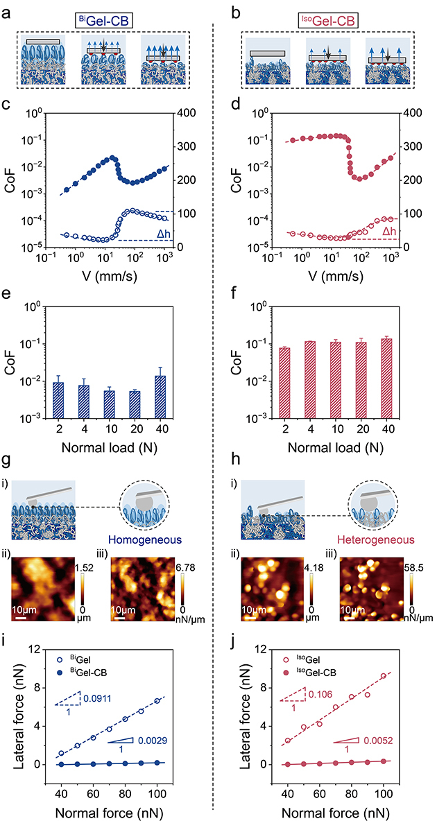 图4.(a) 润滑机制示意图。(c, d) Stribeck曲线及相应水合高度变化。(e, f) 在边界润滑状态下,摩擦系数随载荷的变化。(g, h) 表面的AFM高度图。(k, l) 利用LFM测得的侧向力-法向力曲线及计算得出的微观摩擦系数